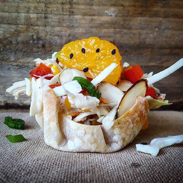 1/3 cup finely diced celery. Press one wonton wrapper into each muffin cup, and liberally spray the tops and sides of the wonton wrappers with additional cooking spray. This unique spin on a chicken salad is made even more special in the way it's served. Wontons are ready when chicken is no longer pink in the center, about 5 minutes. Takes 20 mins including wrapping. Wonton wrappers crisp up in the oven and hold a savory chicken salad with cabbage, garlic, bell pepper and fresh herbs. Using wonton wrappers as serving bowls is an easy and fun way to control portion size. Posted by emily bites in 2 blue, 2 green, 2 pp, 2 purple, all recipes, asian, main course muffins/cupcakes, main dishes. Chinese chicken salad wonton cups. You can make it using leftover chicken, rotisserie chicken or canned chicken — whatever you have on hand. Cool a few minutes then remove to wire rack to cool completely. Spoon chicken mixture into wonton cups. To quickly grab one and pack a salad to take to this recipe is adapted with significant modification from a food network recipe called 5 ingredients: